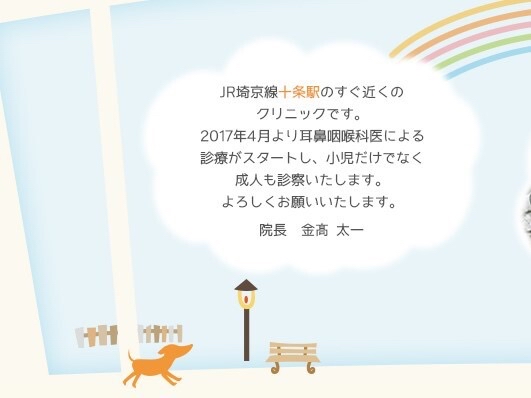 | 概要 | JR埼京線十条駅のすぐ近くのクリニックです。2017年4月より耳鼻咽喉科医による診療がスタートし、小児だけではなく成人も診察いたします。よろしくお願いいたします。 |