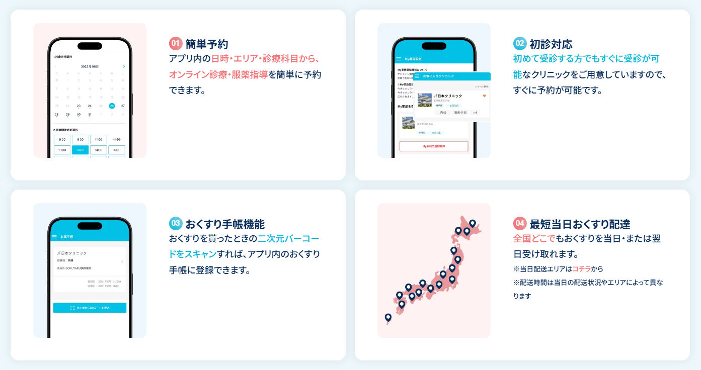SOKUYAKUは、忙しい方や通院が難しい方にとって便利なサービスです。アプリの操作がシンプルで、誰でも簡単に使えます。日時やエリア、診療科目から選べるため、自分の都合に合わせて予約が可能です。
