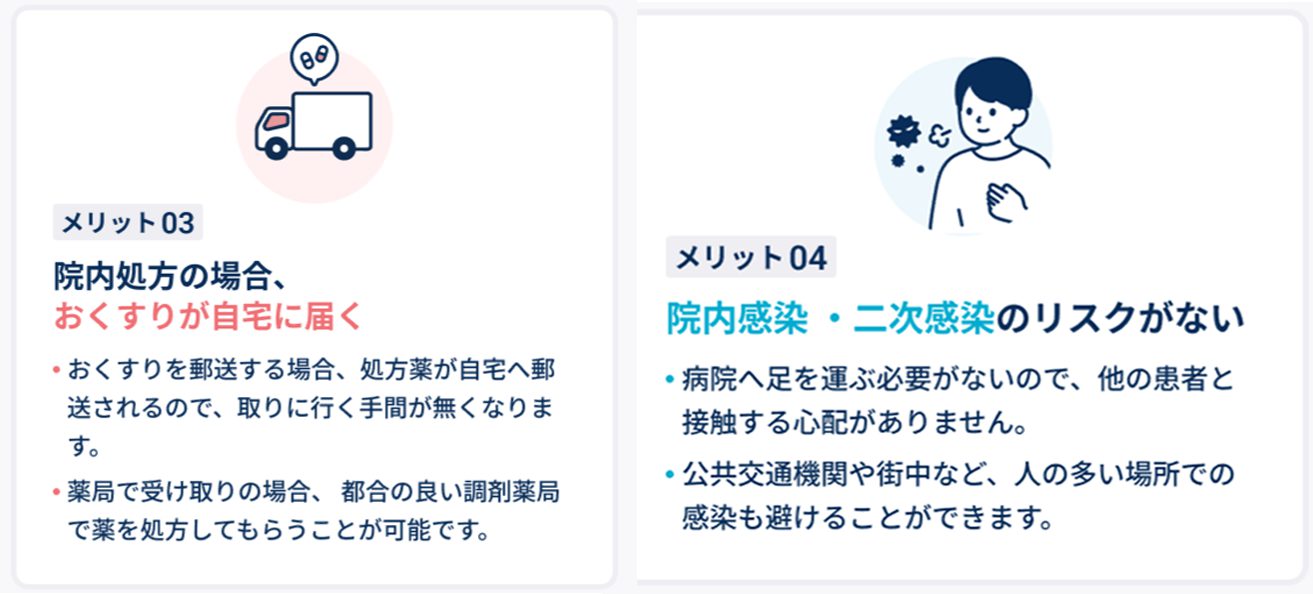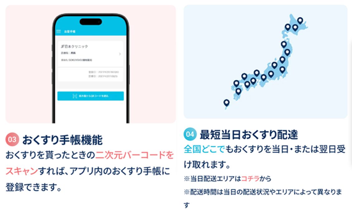 操作に困ったときは、専門のスタッフが電話やメールでサポートしてくれます。処方薬は最短で当日中に自宅に配送されるため、薬局に行く手間が省けます。