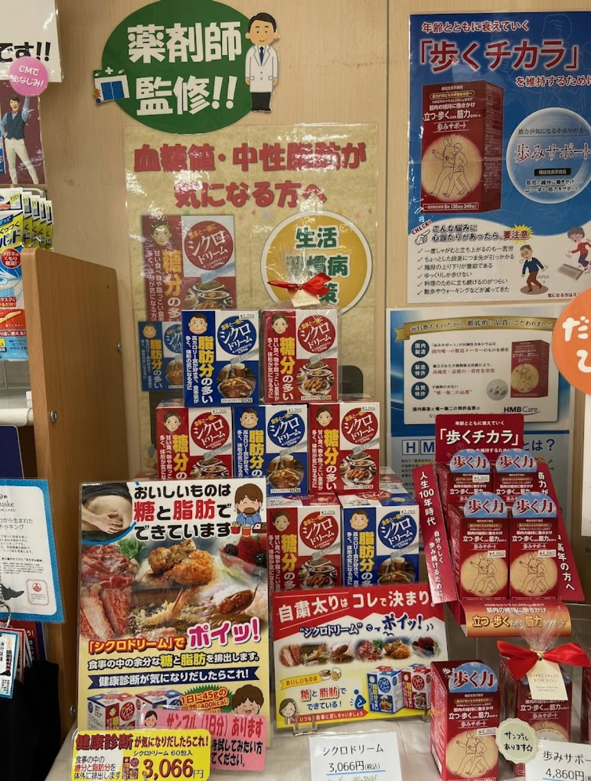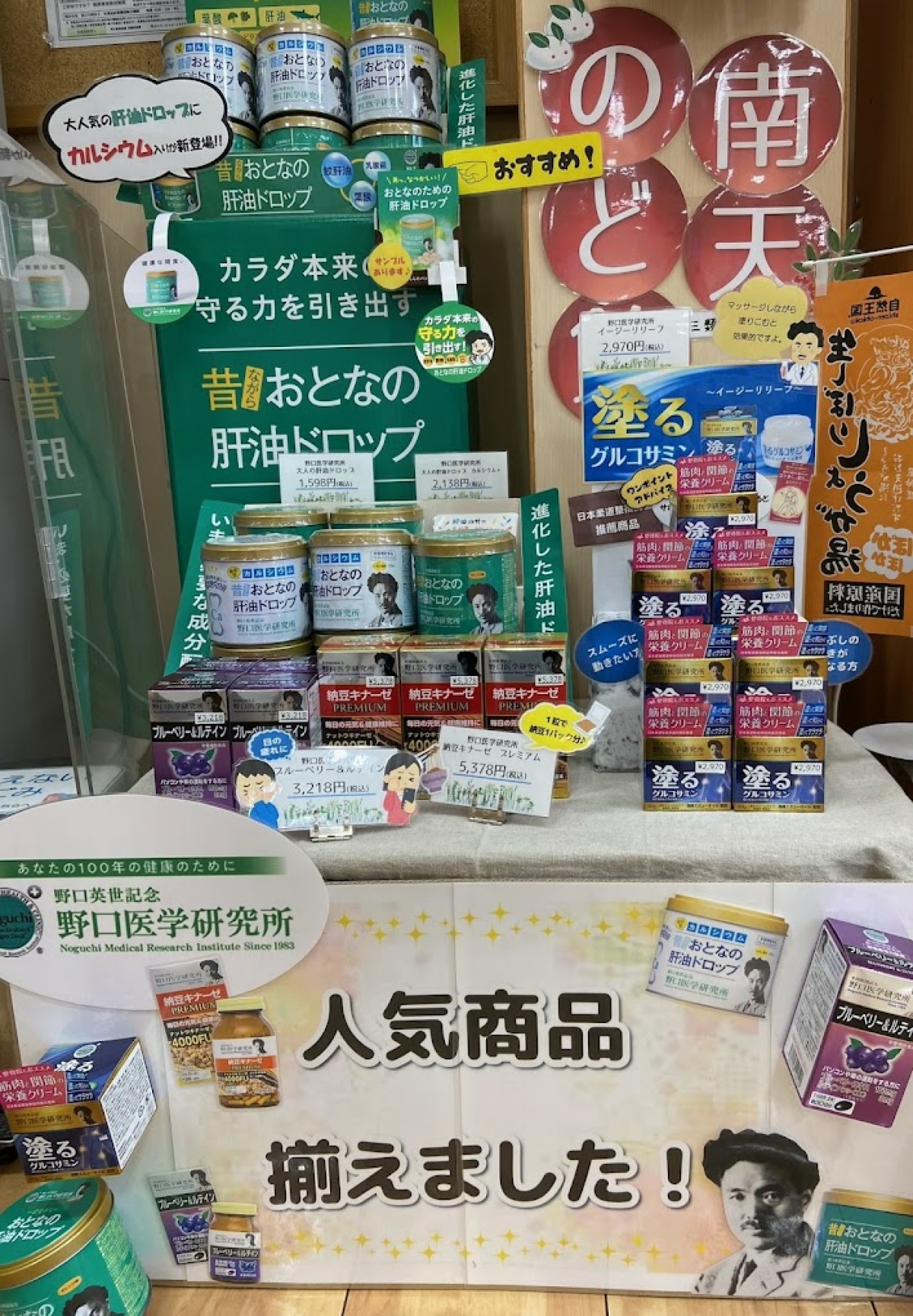 明るい店内には、おすすめの健康食品やスキンケア・口腔ケア用品がズラリ。
