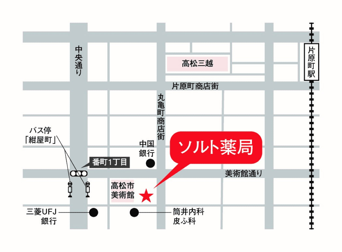 | 概要 | 皮膚科の薬は特に充実しております。軟膏の混合も専用の機械を使うので綺麗に均等に混合できます。高松市美術館のすぐ裏側(南側)です。高松市美術館の地下駐車場、中央商店街共通駐車場をご利用になれます。地域の皆様に信頼され、愛される薬局を目指してます。 |